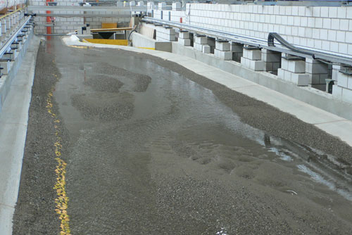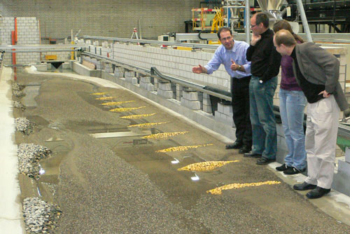 | Modell Flussaufweitung Chli Gäsitschachen Für die Flussaufweitung Chli Gäsitschachen liess das Linthwerk an der Versuchsanstalt für Wasserbau der ETH Zürich einen physikalischen Modellversuch durchführen. Die Ergebnisse des Versuchs wurden auch den Beschwerdeführern vorgestellt. (Bild 1 VAW, Bild 2-5 M. Jud) | ||||||||