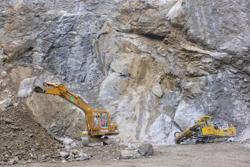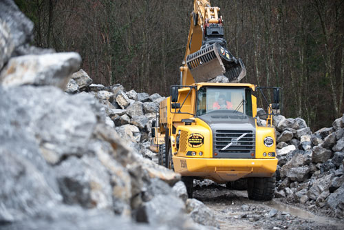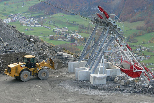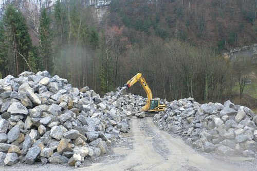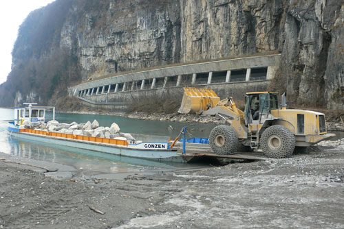 | Stein- und Blocklieferungen Ein Grossteil der Stein- und Blocklieferungen kommt aus der Region. Die Anlieferung zu den Zwischendepots des Lieferanten erfolgt zum Teil über den Seeweg oder mittels einer Seilbahn. (Bilder M. Jud) | ||||||||