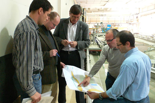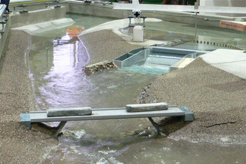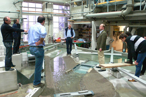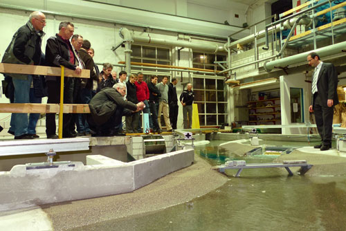 | Modell Flussaufweitung und Überlastfall Hänggelgiessen Für die Flussaufweitung Hänggelgiessen und das Ausleitbauwerk des Überlastfalls am Linthkanal liess das Linthwerk an der Versuchsanstalt für Wasserbau der ETH Zürich einen hybriden Modellversuch (numerisches und physikalisches Modell) durchführen. Das Modell wurde den Gemeindebehörden von Schänis und Benken vorgestellt. (Bilder M. Jud) |