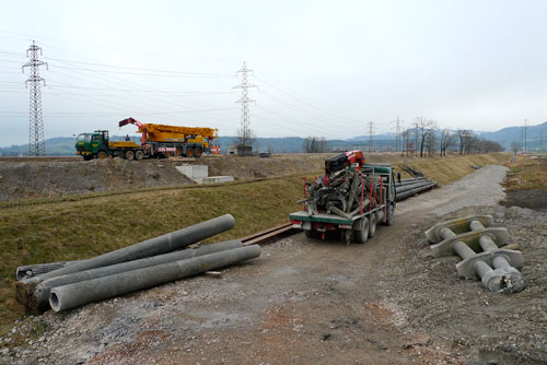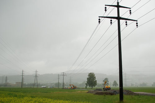 Zwei Hochspannungsleitungen der Axpo AG (vormals NOK AG) müssen wegen dem Linthprojekt verlegt werden. Die Axpo AG nutzt diesen Umstand und erstellt die neuen Leitungen auf eigene Kosten für eine höhere Spannungsebene. Die Arbeiten müssen laufend mit dem Linthprojekt koordiniert werden. (Bilder M. Jud)