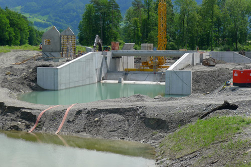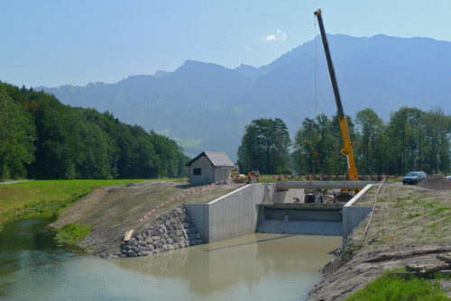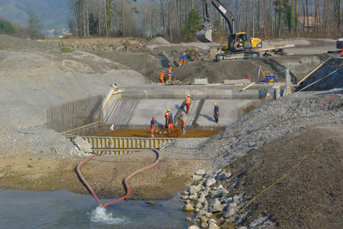 Ausleitbauwerk Hänggelgiessen Bau des Ausleitbauwerks für den Überlastfall am Linthkanal (vgl. auch Bildstrecke «Modell Flussaufweitung und Überlastfall Linthkanal»). (Bilder M. Jud)